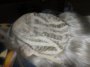 As you can see in the photo, I’ve started cutting just one weft at a time. We don’t want them getting tangled up or knotted! Continue in this fashion until you have all the wefts you need. I didn’t cut up the wefts at the very top of the wig because it’s kind of a circle of hair sewn to make it look natural at the top of the head. So! You end up with this: