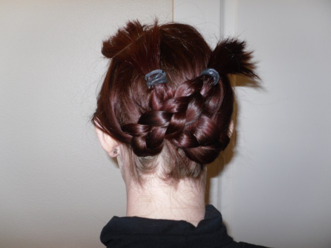 Cross the braids in the back, and pin them tightly to your head with bobby pins.