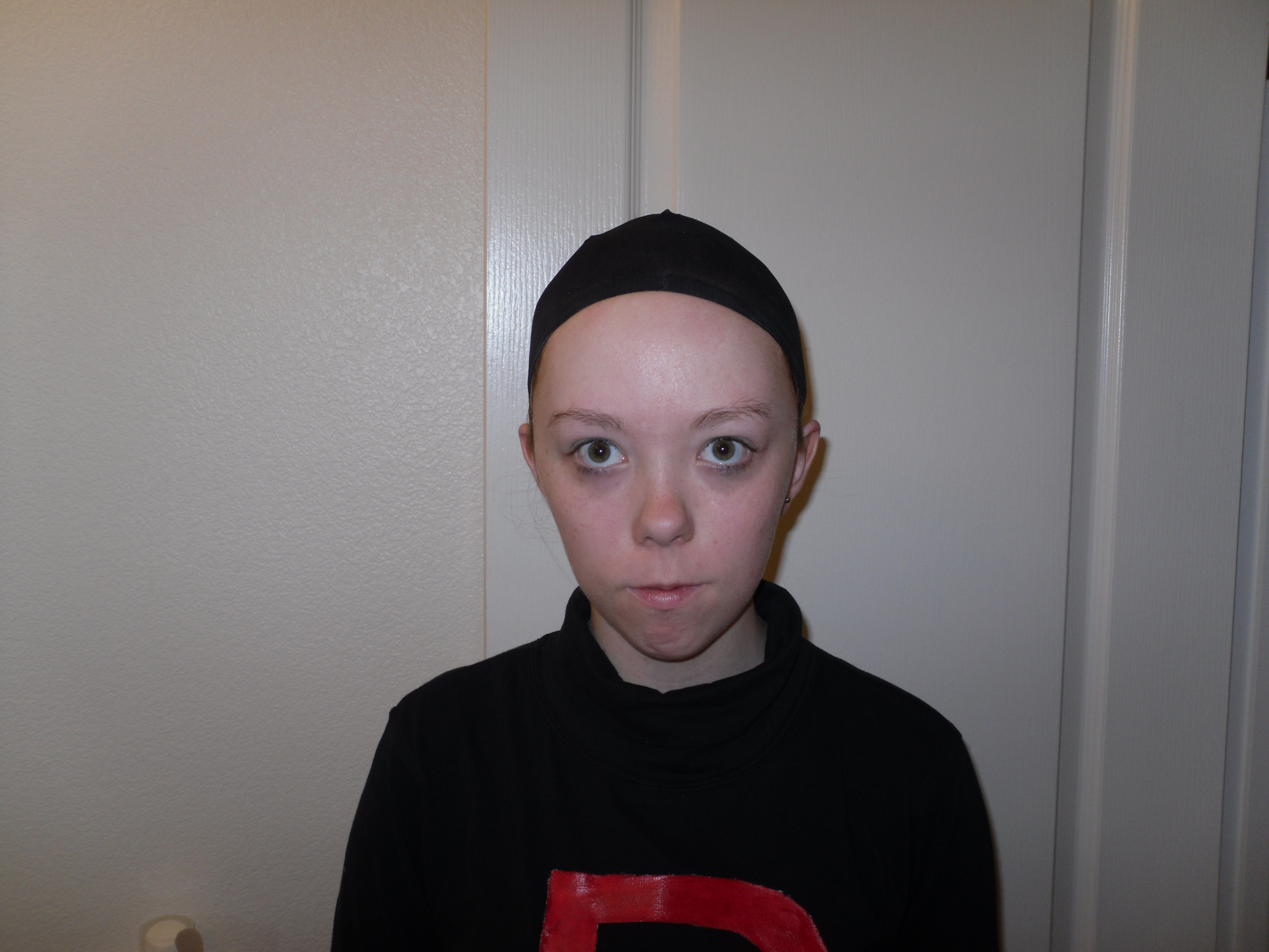 I forgot to get a picture of the back, but put your wig cap on your head, tuck in any stray hairs, and pin the cap to your head as well, at the temples and in the back until it feels secure.