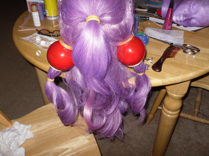 Dyed, added another full wig worth of wefts, made the ponytails and balls and braids in the front, as well as curling the ponytails so they were one big curl.
