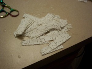 1) Take roll of plaster gauze and cut it into strips. The roll in the picture is about 8″ wide. I usually cut the entire roll in about 8″ x 1″ strips. Then take half of those and cut them in half making them 8″ x 1/2″. Then cut some of the 1/2in strips into about 2″ x 1/2″. I prefer having TONS of the 2″ x 1/2″ strips because of how useful they end up being!