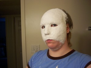 3) Open up the vasoline and smear it generously all over your face. (If you’re a guy doing this I can’t stress how important it is to shave off any beard/mustache/or sideburns you might have before starting this project.) Make sure to get any facial fair covered that you can’t shave off (like eyebrows and wisps of hair that didn’t get covered by the plastic wrap.