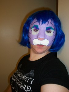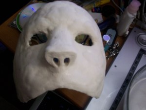 Wait for the clay to dry and turn white. Once it’s dry sand it down if you need to and then you can begin painting. This is where you can be creative! I’m adding some fur around the eyes because I’ll be adding a wig to this mask and ears later. (Lots of ear tutorials already out there on the web!)