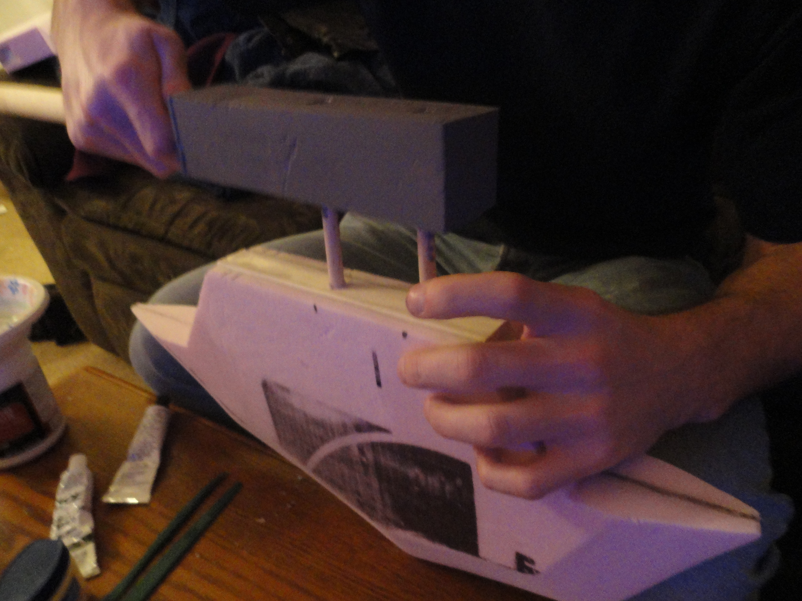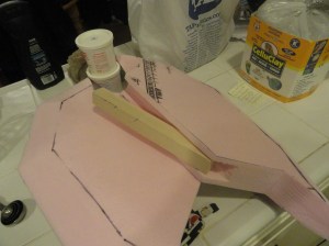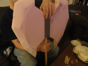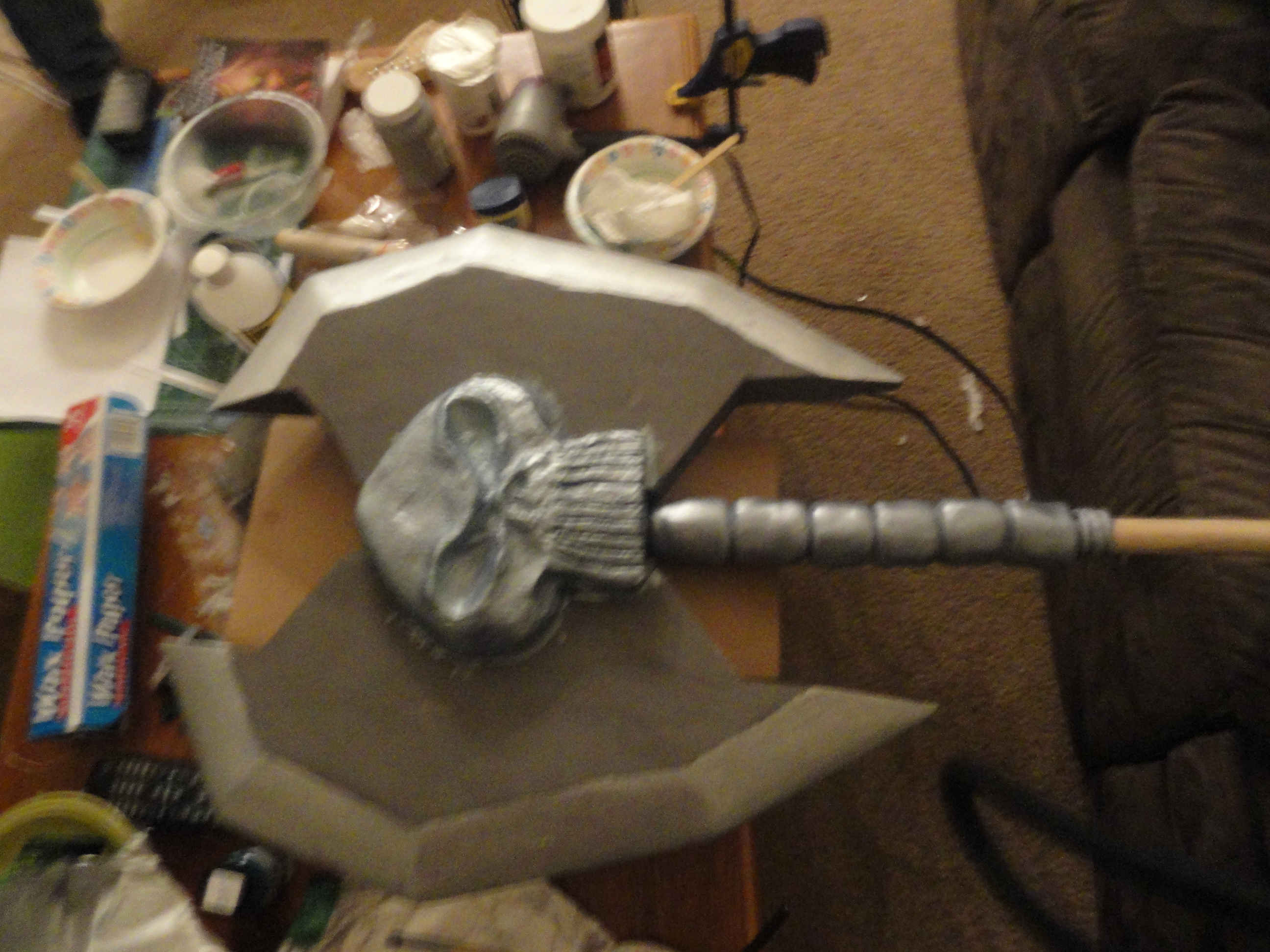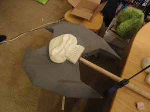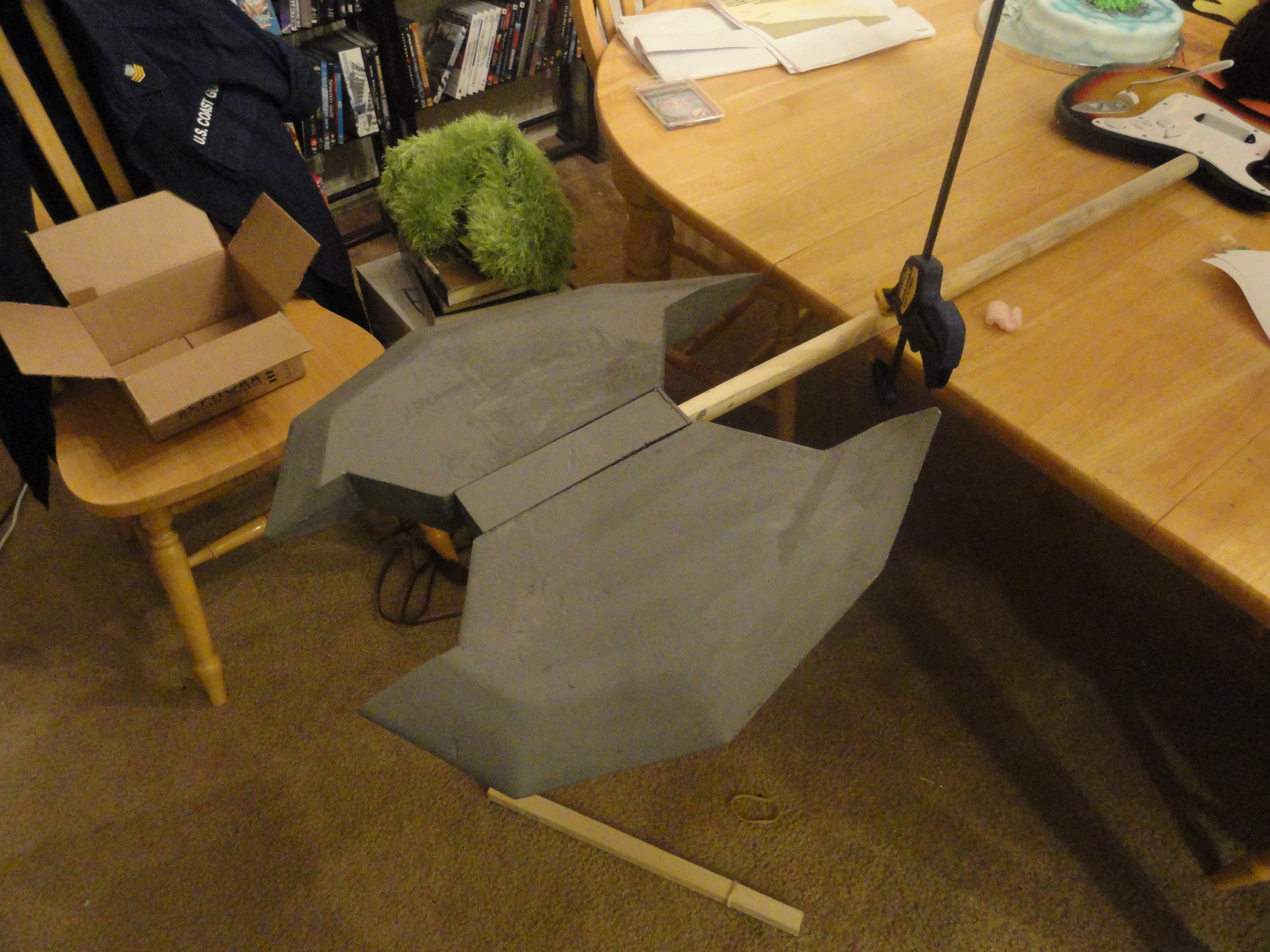 This picture is of the axe slightly unfinished, I went in later with a foam cone that I drilled a hole through and put it on the end of the handle so that the handle tapered properly, then wrapped some craft foam around the handle that wasn’t tapered to make it the right diameter. For the spike on the end, I drilled a hole into the wooden dowel, inserted a metal rod that had bolts screwed on it for counter weight, and molded an end spike using model magic around the rod. In the end, it weighed about 6 lbs, and came apart in two places to have three pieces, the axe head, upper part of the shaft, and the handle. I wrapped the handle in wide blue ribbon first, and then with thinner gray ribbon.