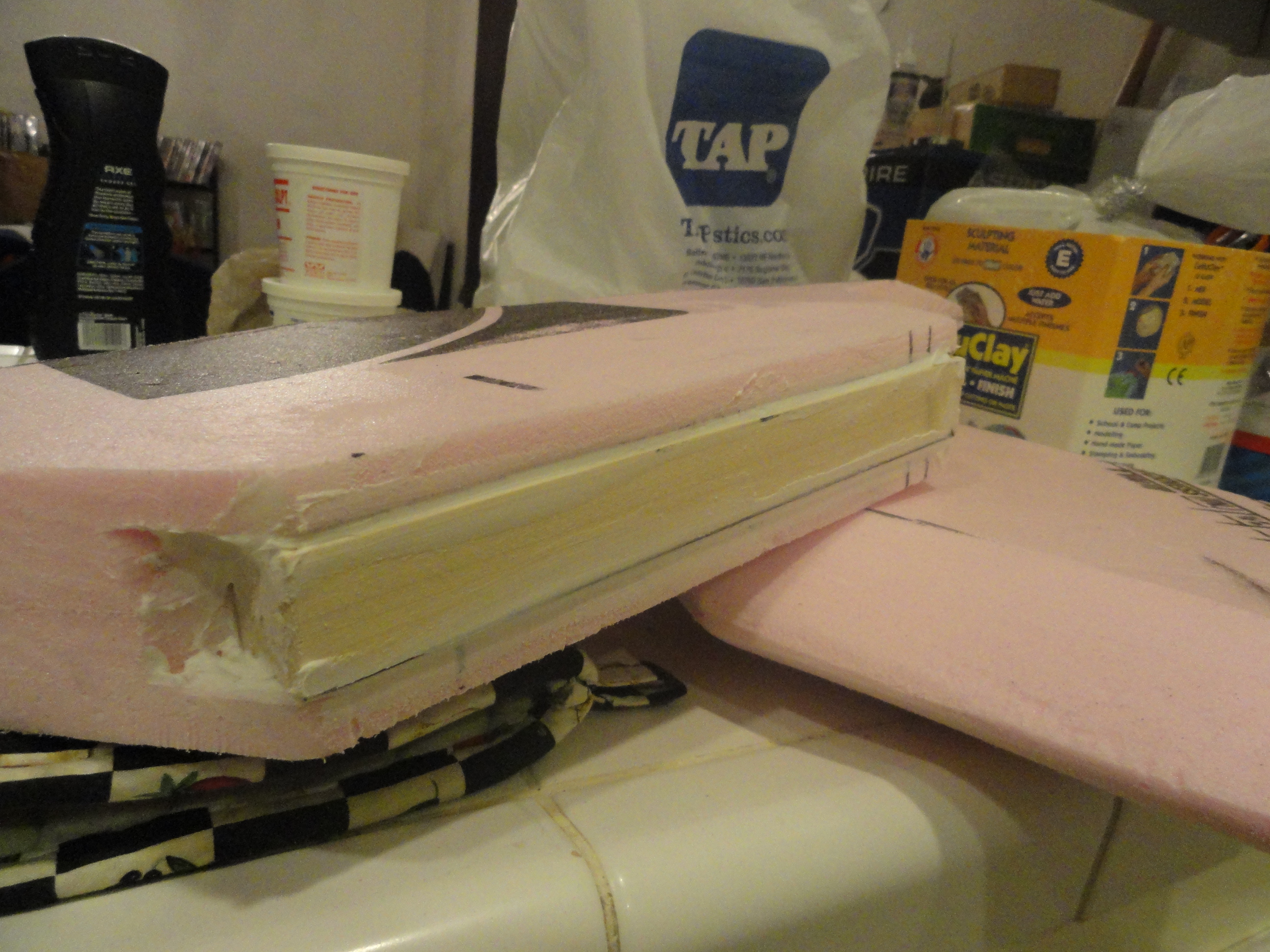 I cut out a hollow on the axe head to insert a wooden block into. This gave me a solid mount and was much stronger then the foam alone. When ever you are doing an insert like this check your fit a dozen times over. You can always remove more foam but putting it back is a real pain in the ass.