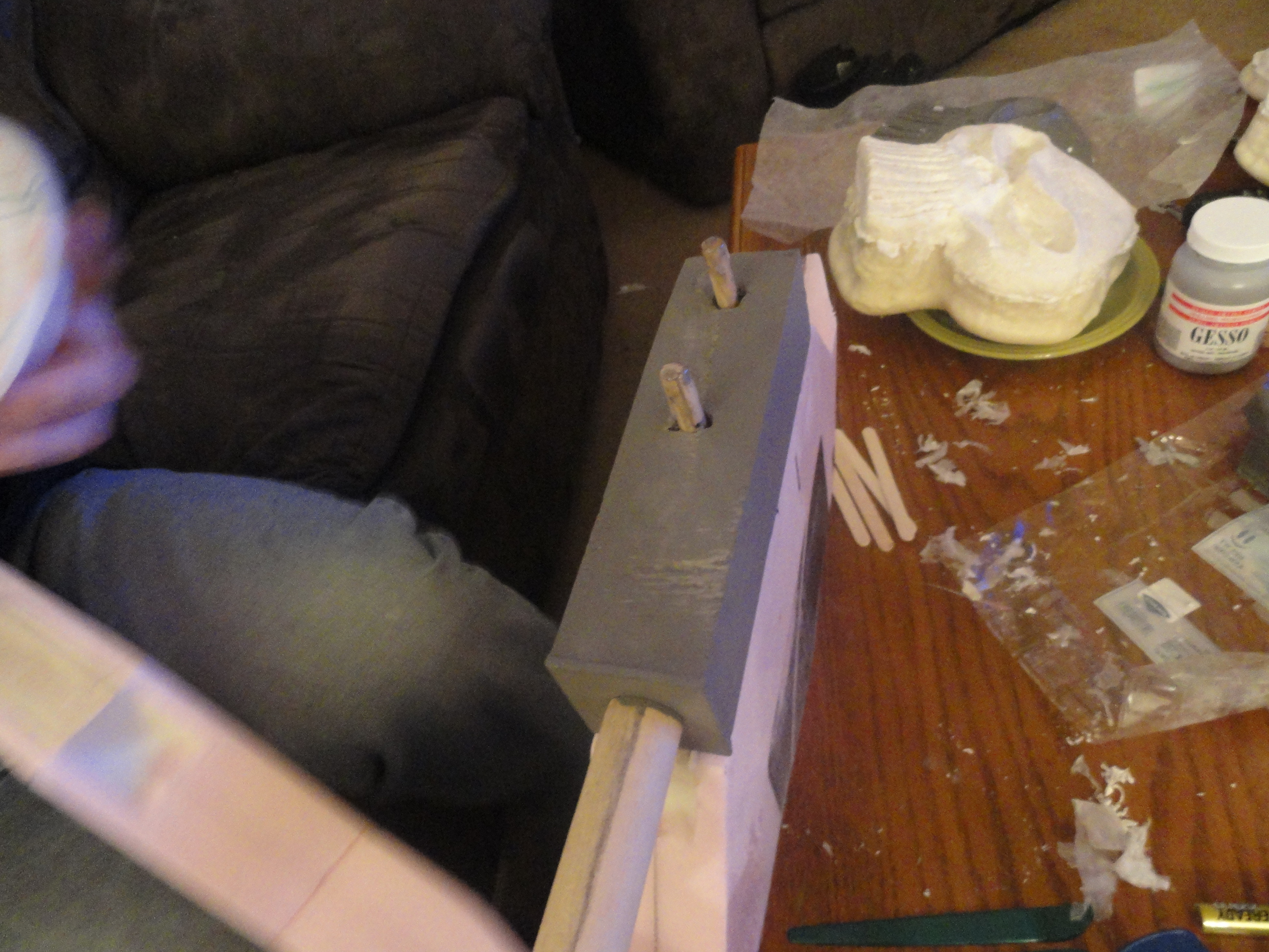 Time for paint and final details. I put a base coat of gray Gesso to help fill / seal the foam and because my final colors would be grays it helped to ensure even color.