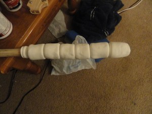 This is the model magic around the top potion of the handle. I rolled out a large tube of it and worked it over the handle. Useing a clay shaping tool I worked the lines into the clay and let it dry over night.