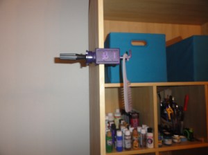 The ponytails on this wig are pretty low, so stick your wig stand sideways, on a door or bookcase, and make sure it’s secure, then stick your foam head on there. I had to wrap a rubber band around the pole the head goes on to so that it wouldn’t slide around from the weight of the hair.