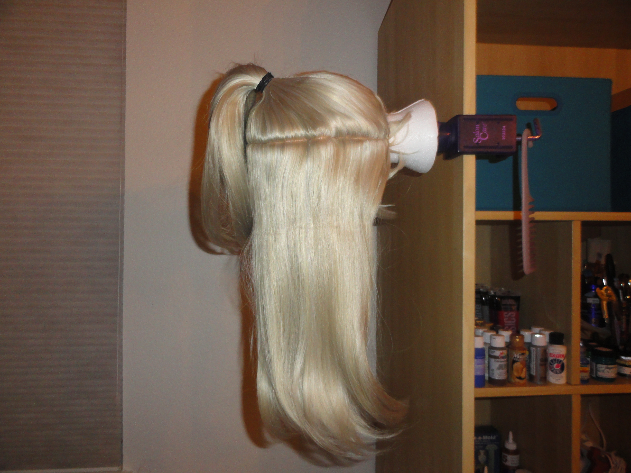 For the hairstyle you’re talking about, I would probably add wefts to the wig like I did in the Tyrigosa tutorial. It will help prevent the wefts from showing when you pull it up into the ponytail, and add extra volume to the ponytail, and it looks like you’ve got braids on the hairstyle too (or part of the hair is down) so you would definitely want to be adding wefts. I do agree that buying another wig would give you a ton of wefts, but if you can find a bag of hair in the exact color of your wig (it can be hard to get it exact unless they’re from the same company) then you may want to make your own wefts to add on to the wig. Here is a pretty good tutorial on making high ponytails that might help you with yours (you click on the left image each time to go to the next step): http://www.cosplay.com/photo/1856065/