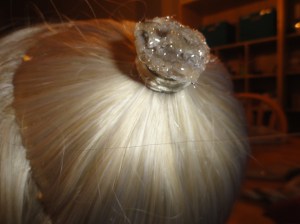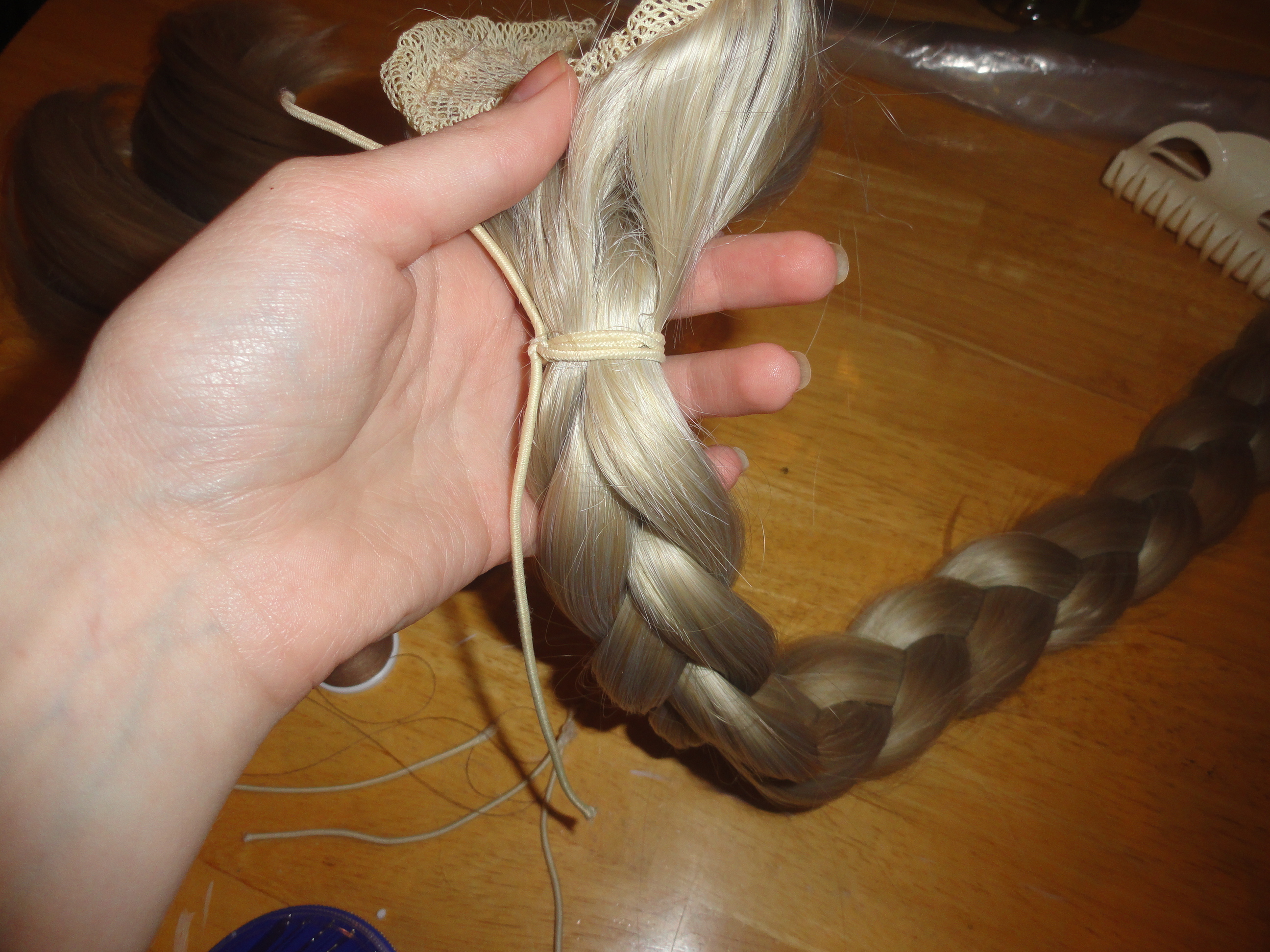 Now, cut the hair several inches above the elastic, or wait until you get the thread nice and tight in there to cut it right above the thread. Wrap the thread around, in and out, until you can’t push the thread through anymore- that’s usually a good sign that it’s going to hold really well. If you didn’t cut the hair before, do it now, right above the thread, and set the braid aside and do the second one. You want to have everything ready to have resin (or caulk, if you don’t have resin) put onto the stub, it’s easier to do them all at once.