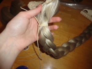 Now the long ponytails: take them out of the packaging (carefully, they’re very long) and before you do anything else, braid it. Do a very loose braid towards the top, because you’re going to be putting thread through and then cutting it and you don’t want the hair being twisted after you’ve threaded and glued all the hairs together. Make sure you brush it all out nicely first, starting from the bottom, then the braid, loose at the top and going tighter as you get to the bottom. Now put an elastic at the top of the hair, right below where you want to cut it (these come on clips that you can just clip to your wig or hair, we’re going to cut the hair right below where the clip ends).