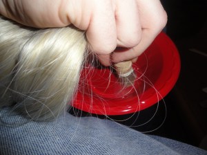 Undo the elastic holding the ponytail in place, and carefully comb out the hair and make the ponytail higher and tighter on the head. A quick tip: don’t wear any rings that might snag on the hairs in this process, and you may want to make sure your nails are trim as well. My rings caught on the hair several times while I was trying to make the ponytail nice and smooth, so I finally took them off and things went much more smoothly.