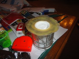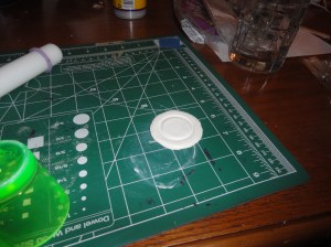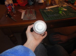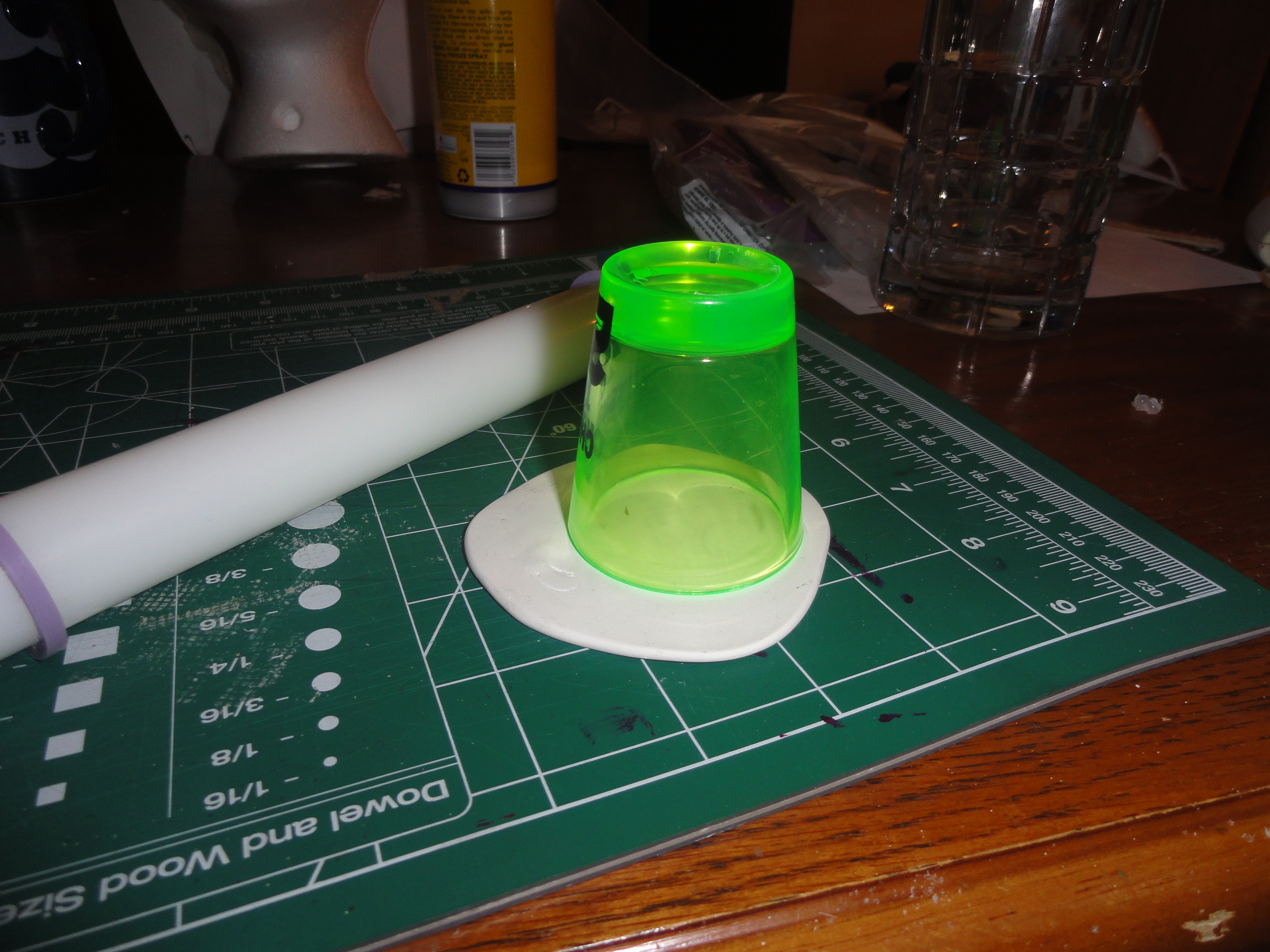 Here it is with the outside and inside rings, but it’s a bit flat, so we squished some Sculpey into the bottom of the shot glass (because it was curved) and then put that on top of the middle circle.