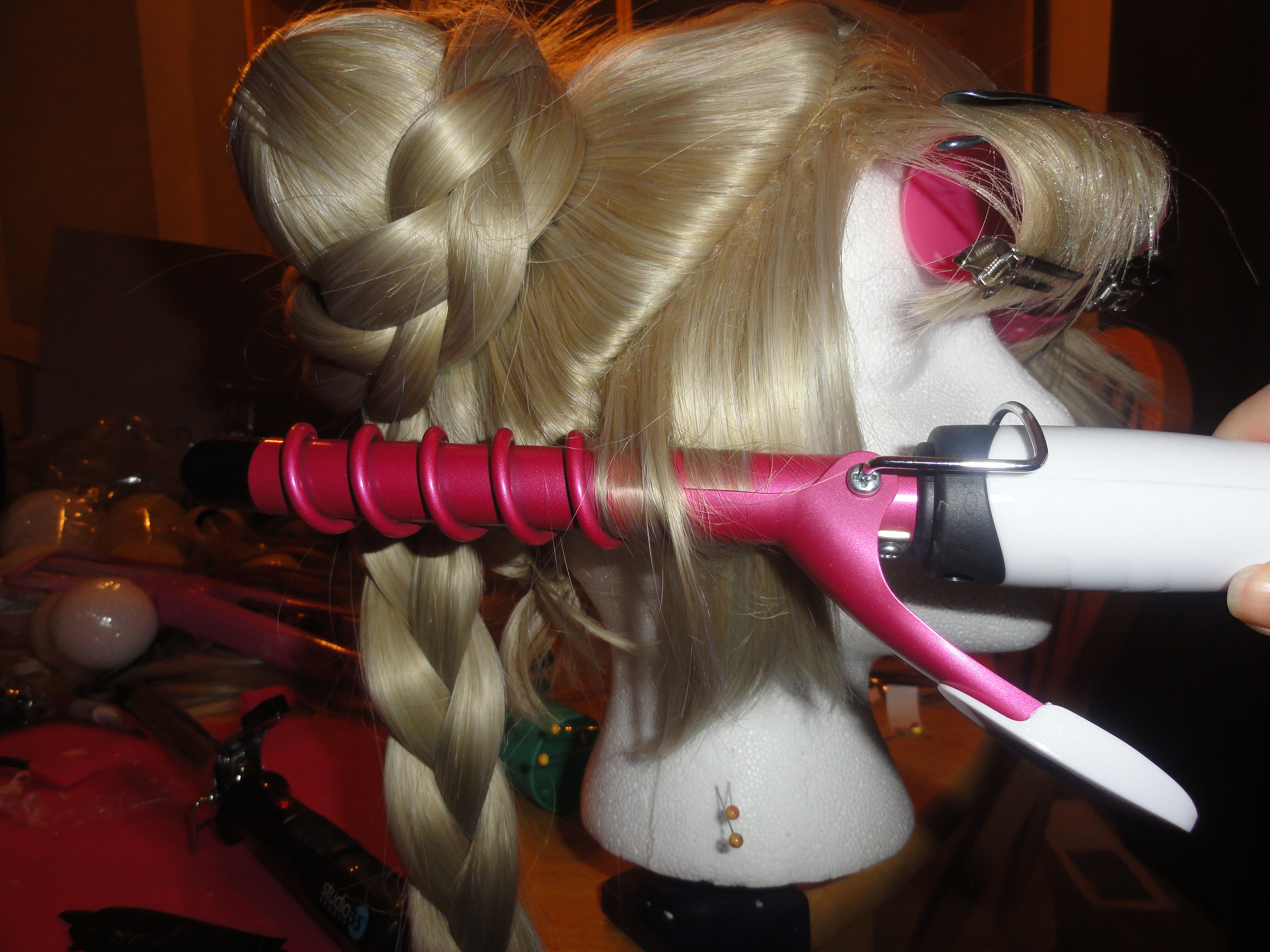 Once again, if you don’t have one or if you wig can not take heat, use a very small curler and lots of hairspray, as shown above. My wig was not taking any of that, and the curler was a bit large anyway, so I stuck to the spiral iron.