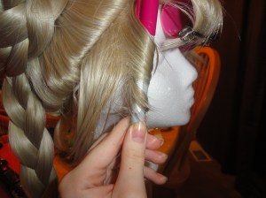 Wrap that hair around, then be sure to put the curling iron straight up so that the curls sit right. I didn’t grab a picture of that part, so here’s one of it sideways. Not the right way to do it.