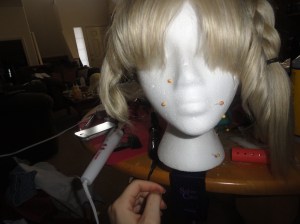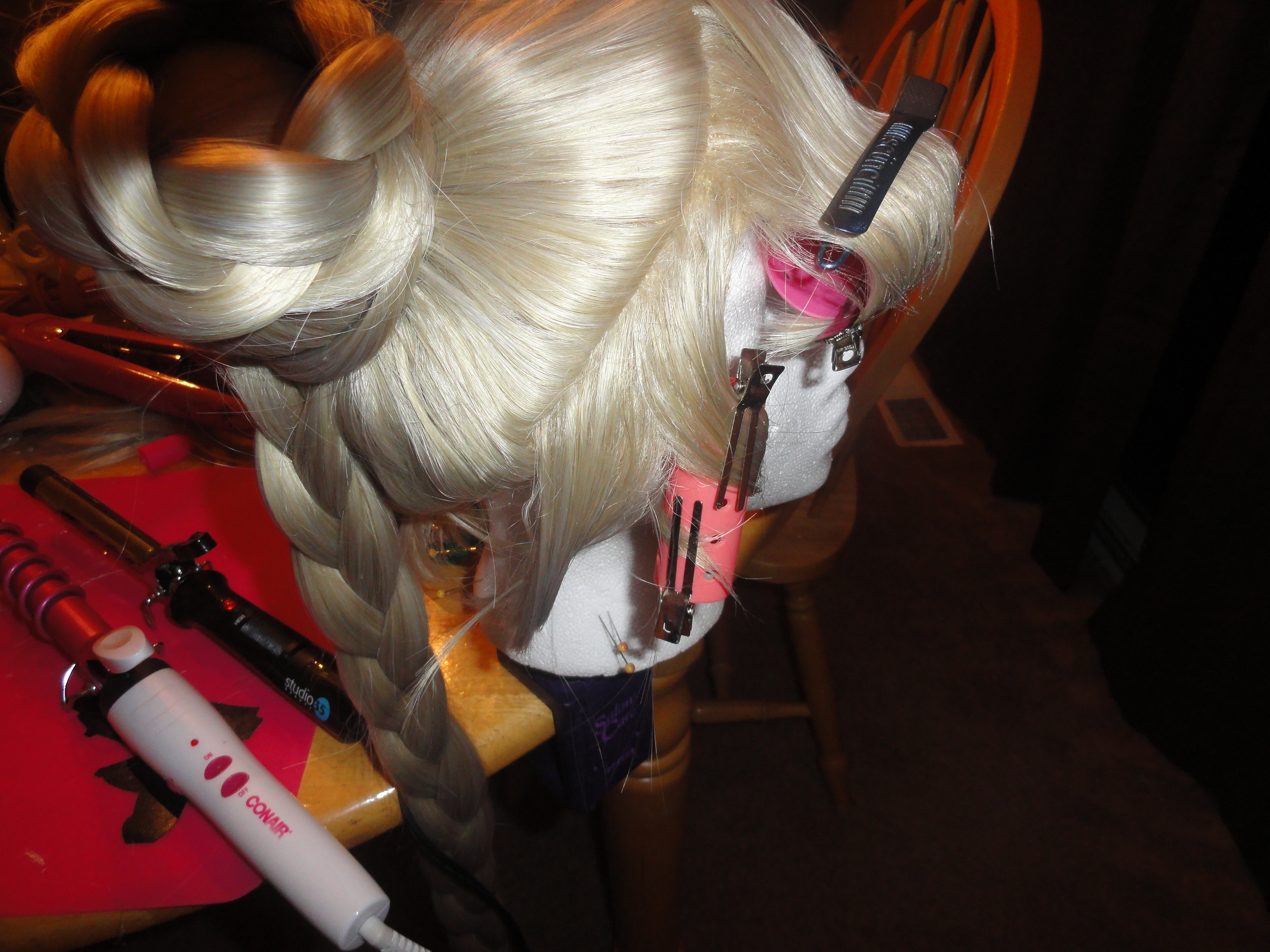 First, cut the bangs. Use a very sharp pair of scissors (but be careful, please, I cut part of my finger doing this, and still can’t feel the sides of said finger even though the cut is healed) and cut straight across to get the right length you’re looking for, then cut up into the bangs, for the first 1/4 inch or so , to get a more razored look, that it’s just straight across. Then grab a curling iron (I promise all the wigs from Arda-Wigs are heat styleable, but if your wig isn’t, use curlers and Got2B hairspray instead) on high heat and separate the bangs into four parts; the right and left side, and then the top and bottom of each. Carefully curl each part, and then spray with the hairspray.