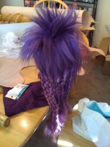 When we first saw the picture I was going to base my witch doctor off of, I had no idea what the hair was supposed to be like. We didn’t know if it was dreads, just spikes, feathers, what. We finally decided that we would make the wig two toned: Purple on the top, spiked, and then with longer braids going down the back (pink, but covered with ribbon so it didn’t matter) with large beads on them.