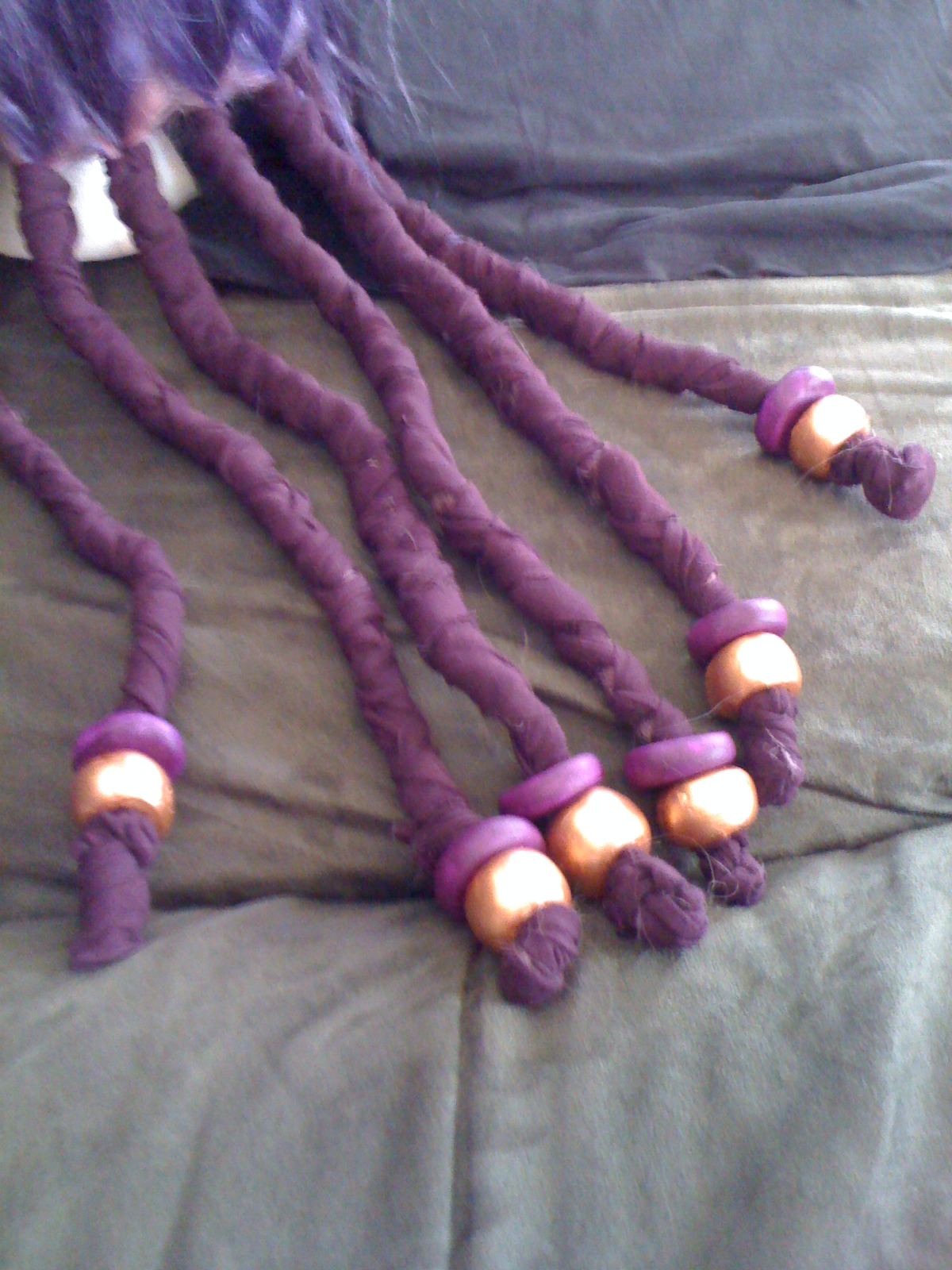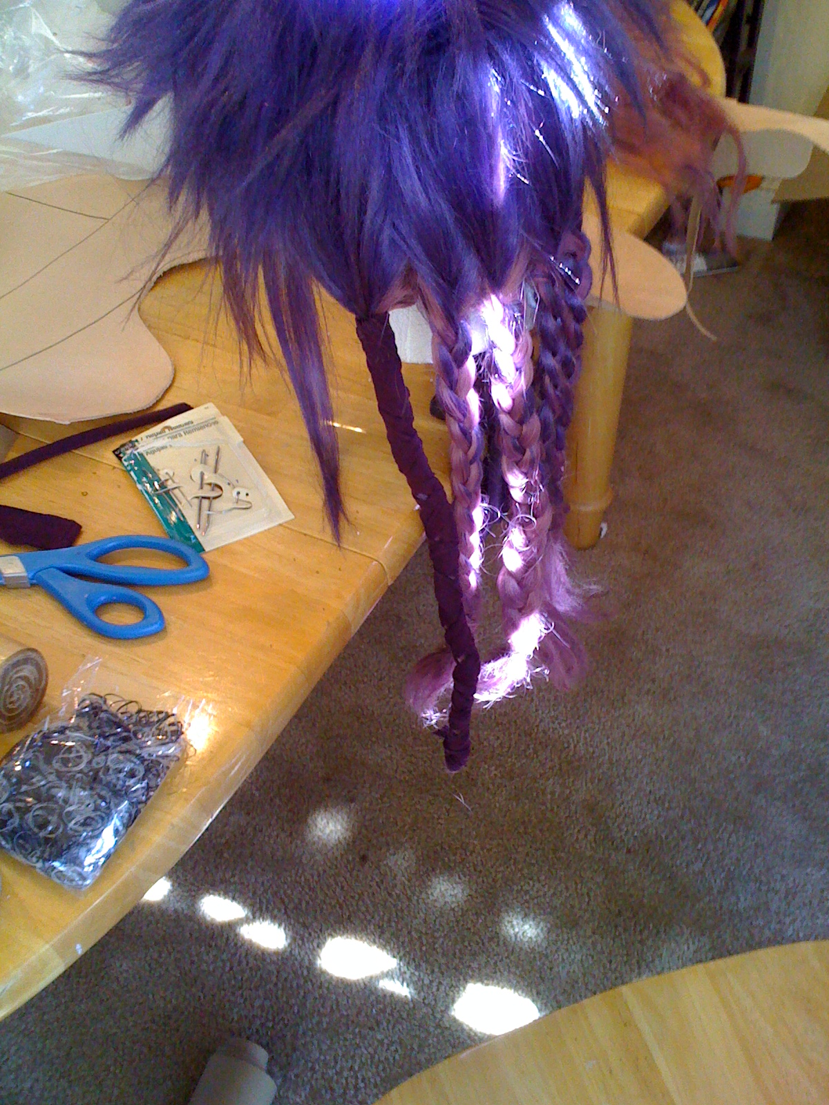 After the hair was sewn on and braided into evenly sized braids, I secured the ends and then cut up strips of a purple cotton fabric I thought would be perfect for wrapping the braids with. I decided not to go with ribbon because it would be too stiff or too shiny, and the fabric I used was just right, and stretchy too. (It was difficult to wrap the braids just right, and did take me several hours, but after some tightening and adjustments the braids were fully covered.)