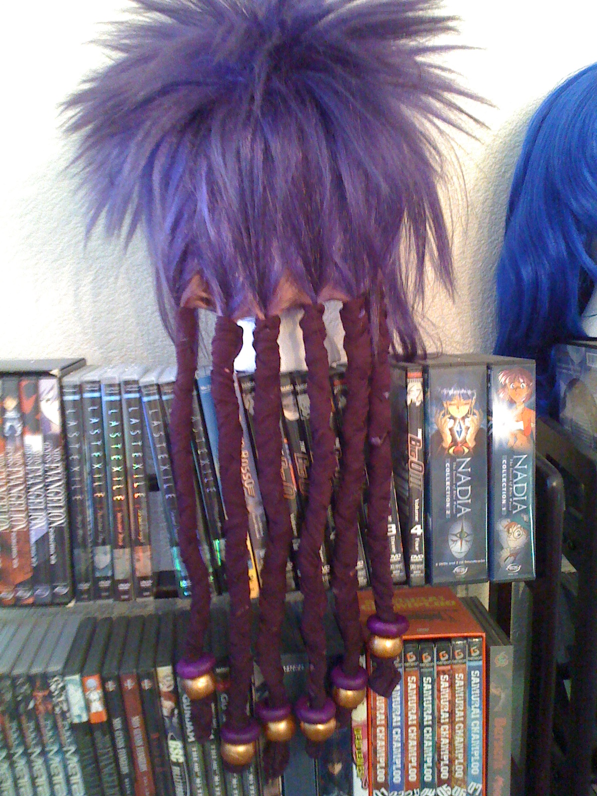 I started out with a Punky wig and (after I dyed it a darker purple) sewed a ton of pinkish purple extensions along the back part of the wig, to make it more full and long so I could have six good sized braids.