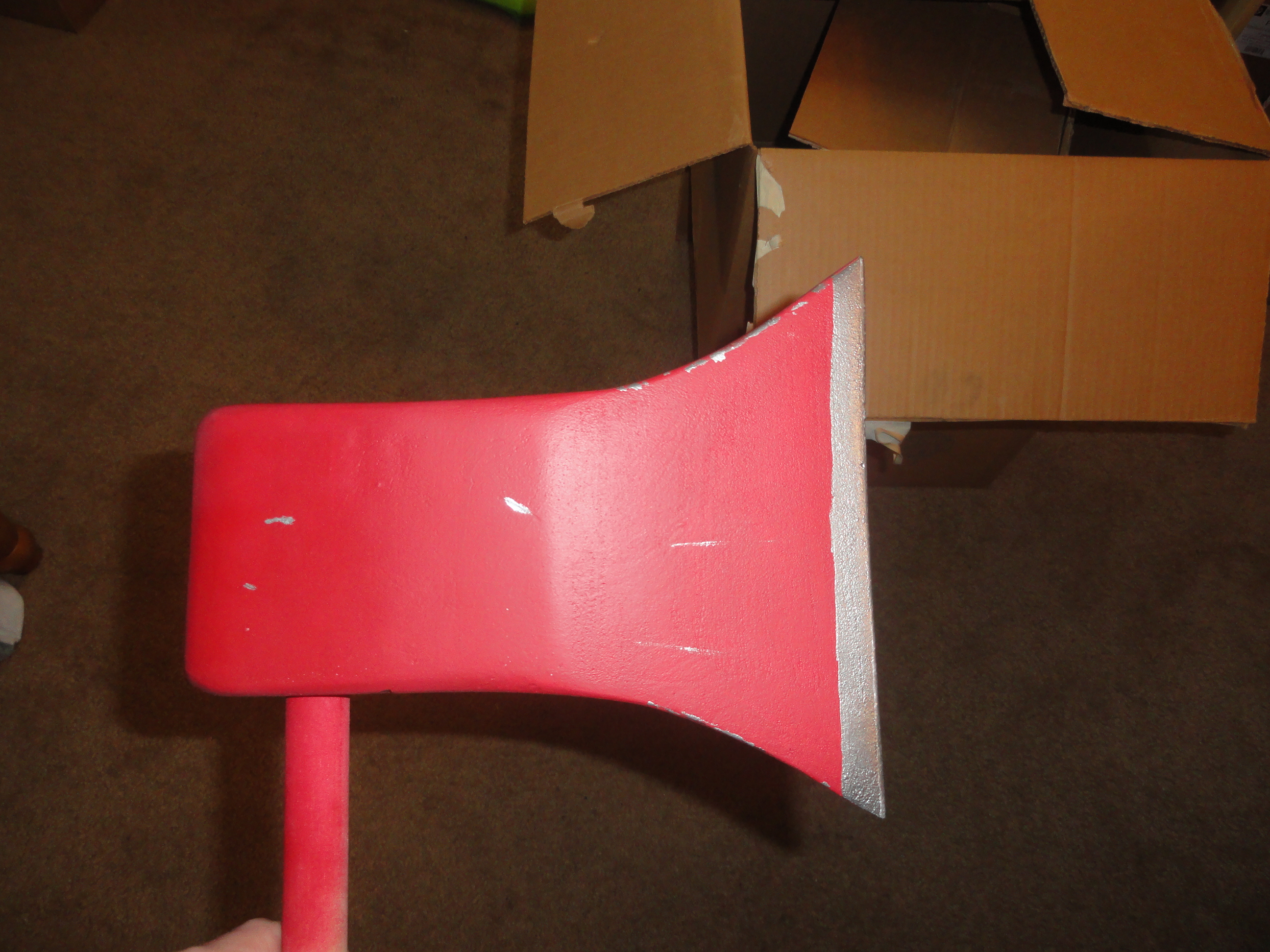 We wanted to make sure the foam was fully sealed before using spray paint, so that we would avoid any melting or damage to the foam which some times can react to the propellants in the paint. So, we coated the axe head in Gesso to achieve this solid base coat.