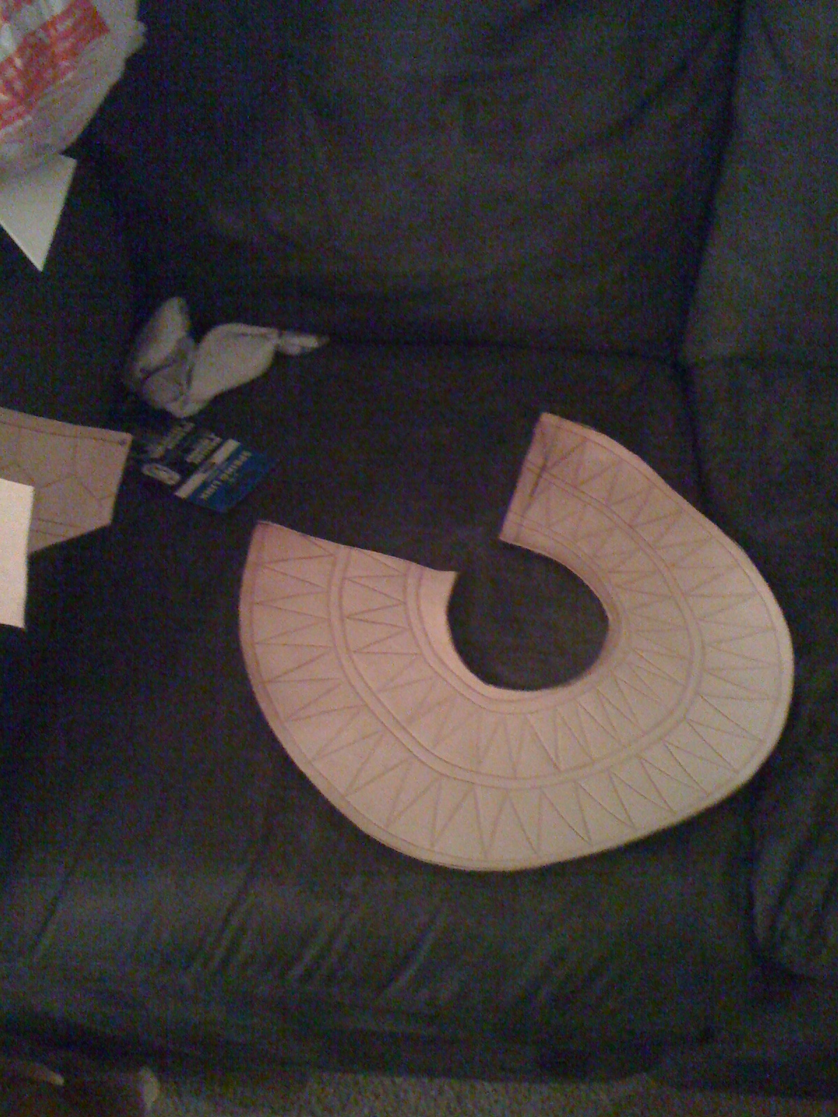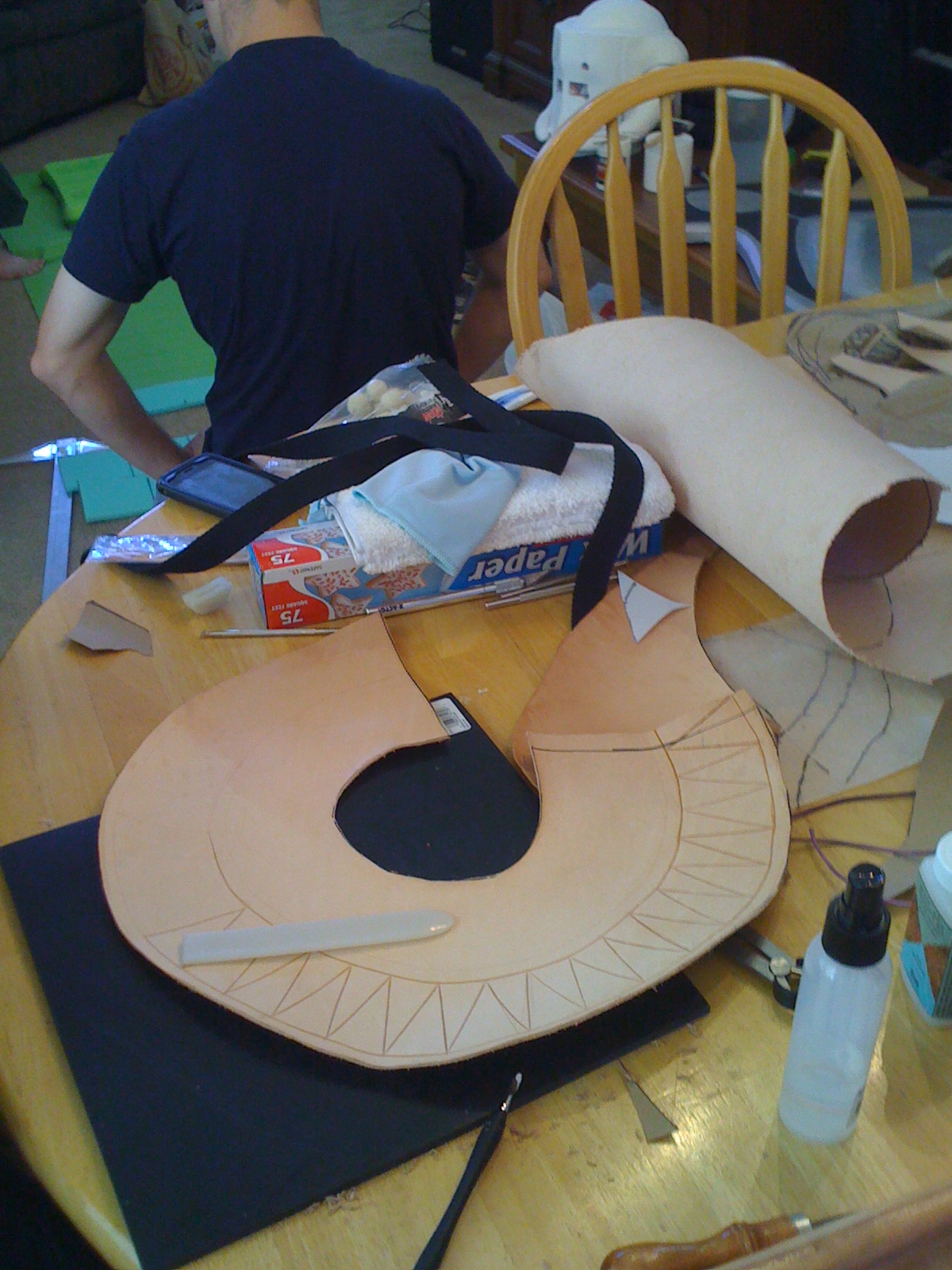 We decided leather would be the best material for the collar, and since we had a ton of the stuff laying around from Mario’s Witch Doctor, we made a simple pattern on paper, adjusted it until it had the right shape and would sit on my shoulders the right way, and then traced that onto leather and cut it out.