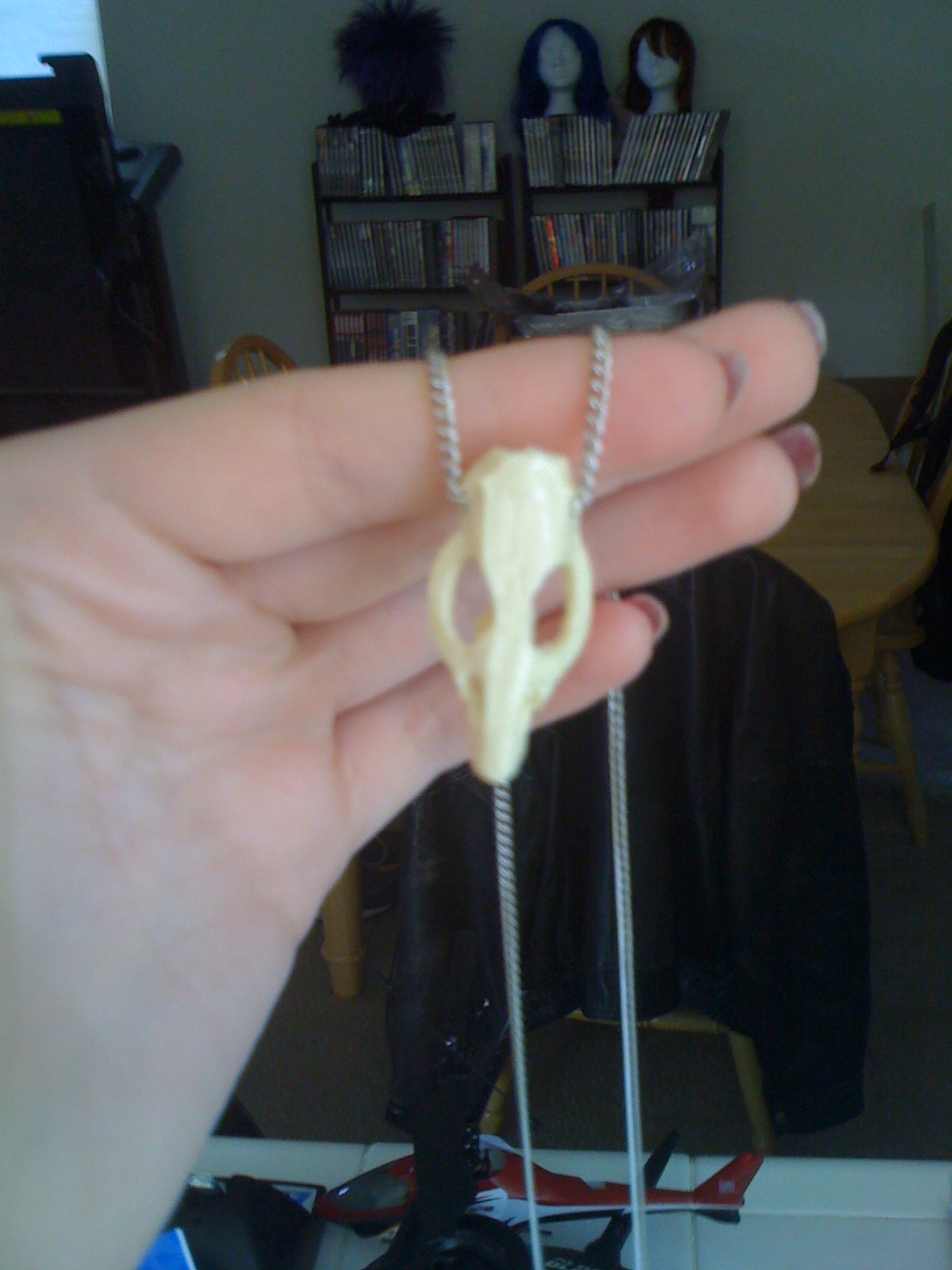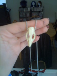 If you look at the picture, she has three necklaces on. One is a simple gold string with a small skull of some sort on it, one is covered with beads and has a big gold/green bead at the bottom, and one is… red or purple with teeth/claws hanging off. For the one with the skull, I simply ordered a skull necklace from Etsy and transferred it from the chain it was on to a black cord. With the tooth necklace, we were lucky enough to stumble across one at Walgreens around Halloween time, and bought it there and then modified it a bit (it had something hanging from it in the front, I forget what) and repainted the teeth to look more realistic and less fake and Halloween prop-ish.