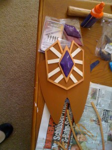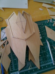 We then made the border for around the mask, and all the details that were raised were also cut out of balsa wood. (I’m missing the other pictures of that progress, sadly.) The diamond shape was to figure out the size that we would need to make the gem, since there is a gold border around it.