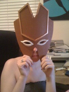 The mask really required a lot of planning and ingenuity to keep it light and secure on my head, while being under the wig so that you couldn’t see the strapping. We went with the inside of a construction helmet (the strappy bits) to keep it held on my head, and balsa wood for the mask and details on the mask. It was actually the most time consuming part of the entire costume.