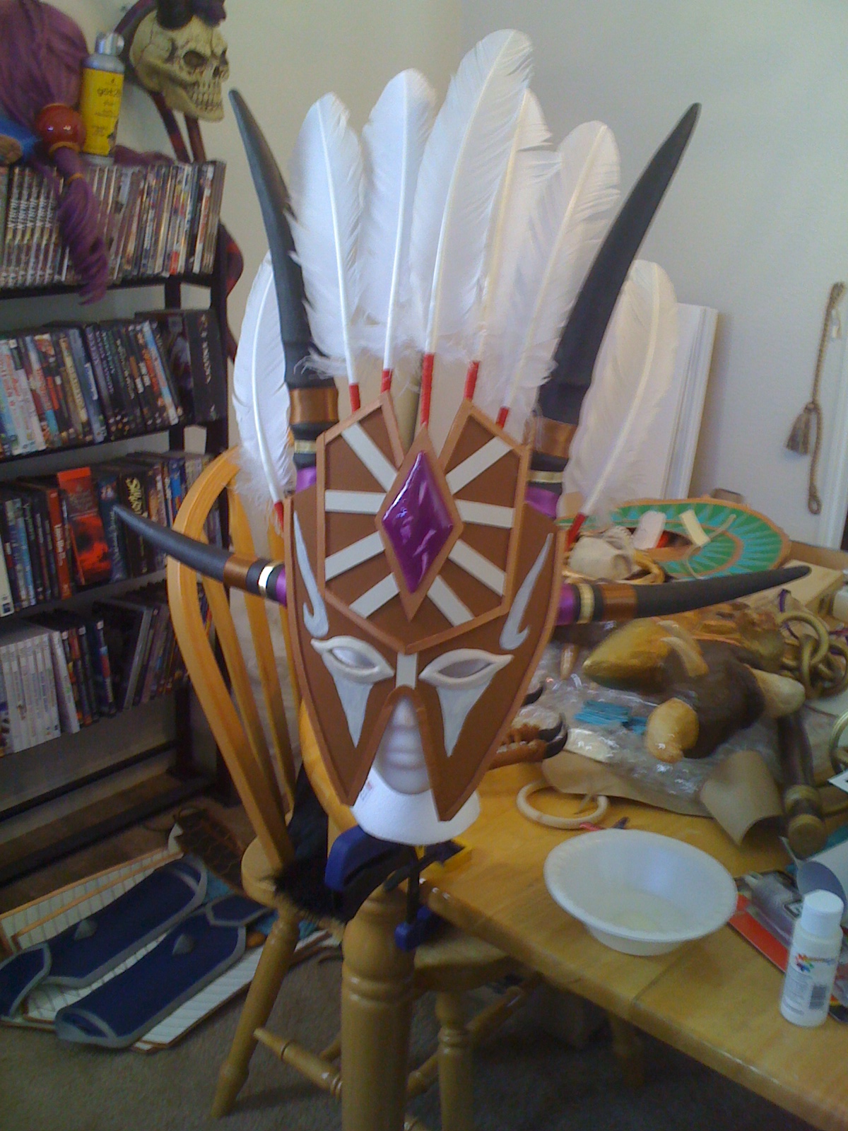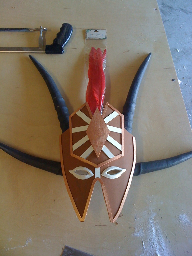We ordered horns from here (we would have gotten larger, real ones if we could, but it was entirely too much money, and neither of us is good enough at sculpting and keeping it light to go that route) and cut them, then attached them to the back of the mask using two part epoxy. They were amazingly light on my head. The red feather is there to try and decide if they were the right height, since we still had to go out and get the white ones.