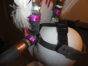 After wrapping the horns in three different ribbons each, and wrapping the base of the feathers in red string and then hot glueing them to the back of the mask (which was also covered in Wonderflex), we atttached the mask to the head harness using some folded pieces of Wonderflex to hold it away from my face the right distance, and two part epoxy. It held up wonderfully!