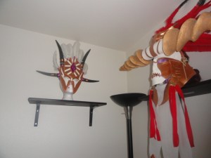 The only details on the mask that aren’t balsa wood are the triangles under the eyes, and the white marks near the temples. Those were just painted in. I’m very happy with how it turned out! I know that it also looks like there are red feathers all around the mask, but we took some creative license with that and made it the purple spiky hair for the wig instead.
