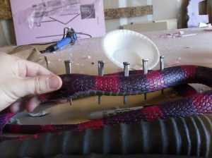 We also found these awesome, hand made looking nails and nailed them into the head and first six or eight inches of the rubber snake. We also punched holes into the skull where the nails would be sitting, and poured two part epoxy into the holes, as well as on the skull where the snake would be sitting. Then we set the snake in it’s place, held it for about twenty minutes to make sure that it was set and wasn’t about to fall out (it was pretty heavy, at five feet long). Then it was done!