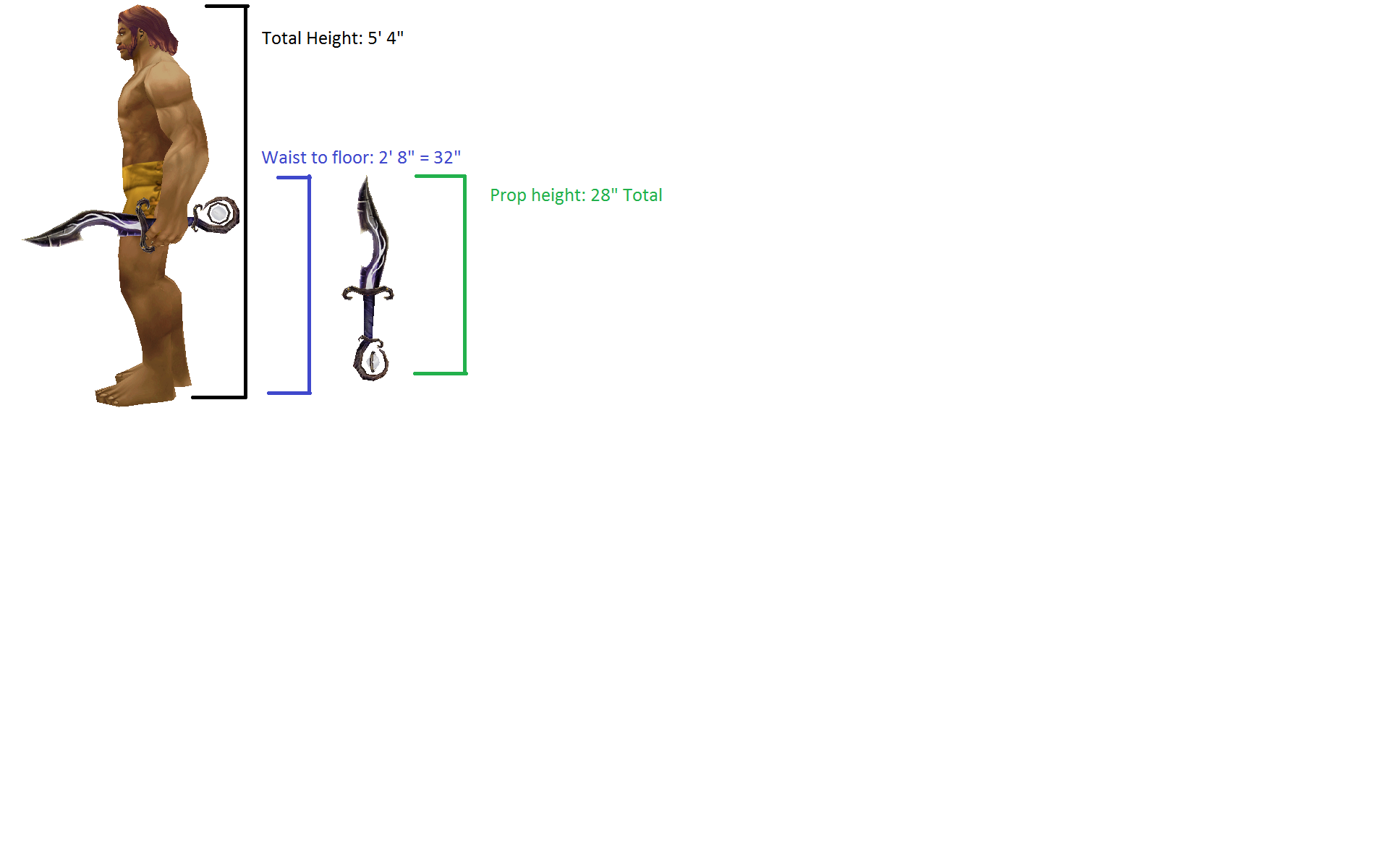 I did basic human anatomy and used the waist as a half way in total height. The weapons are for a female cosplayer but WoW has some gender issue and sizes the weapons very strangely depending on who holds them. I feel that the male human is as close to “real life” as you can get, so that’s the template I use.