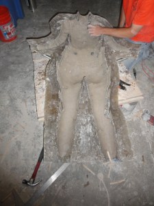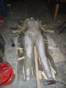 This weekend, Mario and I attached some steel rods for support so the fiberglass mold won’t warp (we’re likely adding on more later on) and unmolded Kerrigan. We started by first drilling holes around the mold for bolts to go in to, then inserted the bolts and secured them with wing nuts. Then Mario used a vibratory saw to clean up the edges so the edge of the mold would be cleaner, and finally we found a seam and started to gently pry open the mold by inserting a screwdriver, and then inserting popsicle sticks all the way around.