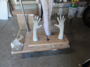 Build a platform to stand on that has something attached you can rest your hands on, and make sure your arms are far enough out from your body that the underarms are easily accessible. I did not have my arms up high enough, so the armpits were a pain for us to cast, mold in fiberglass, sculpt on and then mold again. Don’t make our mistake. (We did make a few mistakes, just from doing it the first time, and the purpose of these tutorials is to make sure you don’t do the same.)