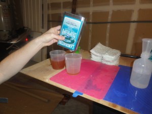 Measure out your resin, then quickly measure your catalyst and pour it into the resin, stirring quickly for at least 45 seconds to make sure that the catalyst is evenly distributed. We LOVE this dispenser for catalyst that we got from Tap, it has a handy measuring device in the top and is much better than measuring out drops.