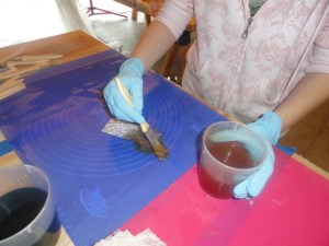 If your sculpture is of a glove or mask or anything with much detail, you want to use gel coat first. We used a clear gel coat, you may be able to find it at a marine supply store. Follow the instructions with the packaging- it uses the same catalyst as the resin we use for the fiberglass matting- and gently brush a thin coat all over the clay wall and sculpture. You only need one good coat, but sometimes with the gel coat it can slide around if it doesn’t want to stick to your sculpture, so keep an eye on it, and take it slow. I think ours took up to an hour to cure enough to put the fiberglass on top.