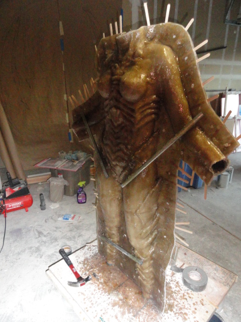For the body suit, we did three full coats of fiberglass matting on the body, and four on the wall, because it was such a big mold and we wanted to make sure that it was strong enough. A note on the body mold: it took us two 17 hour days, with only breaks for some sleep and quick food to finish it, I honestly don’t even know that this mold could be done in one day unless there are a team of at least 5 people working on it together. It was exhausting.