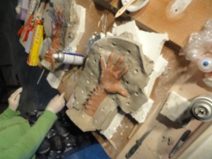 (I will be using pictures of other pieces I have made clay walls of since I don’t have as many as I’d like of the stone hands being molded)