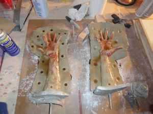 It’s easier to have two people working at the same time on this, one to wet the cloth with resin and one to apply the cloth to the hands. Mario did a simple tutorial on the resin here, so check that out if you’re unsure of how to work with resin for fiberglass, and how to figure out how much catalyst you have.