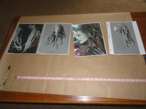 For the dreads, I drew out guides on a paper, measured them and made sure they were the right width. I based the widths on a picture of Kerrigan’s head with the dreads coming down, there were some super skinny ones in front, then a few larger ones behind those, then even larger ones behind those… all in all, I think I decided there were five sizes, and so I drew out five sizes of dreads.