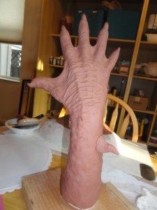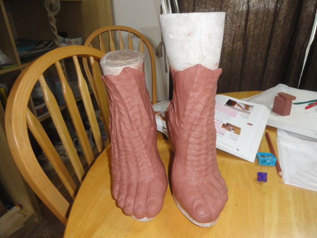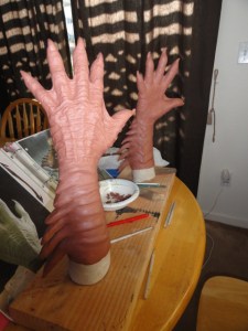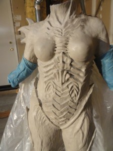 We used two different clays for our sculptures, Laguna WED clay (we went through maybe 150 lbs using it to sculpt the body suit, and using it for all the clay walls) and also Chavant Le Beau Touche (for the gloves, feet, cowl and dreads).