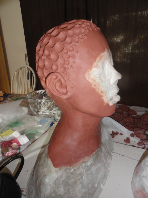 Another word of advice, if you are doing a cowl, like we did, and you are going to have a large mass under the cowl, like we did, then sculpt the forehead lower than it needs to be, because it will stretch and be much higher than it should be in the end.
