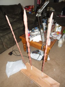 A base for your sculpture. If you’re using hands or feet like we did, have a base for them to stand upright on. If you made the resin hands like we suggested (you will notice our hands are stone in all of the glove pictures; we didn’t have time to make the resin hands beforehand but we don’t suggest waiting until after like we did) then you’ll have rods sticking out the back, these can be stuck into wood for a stand.