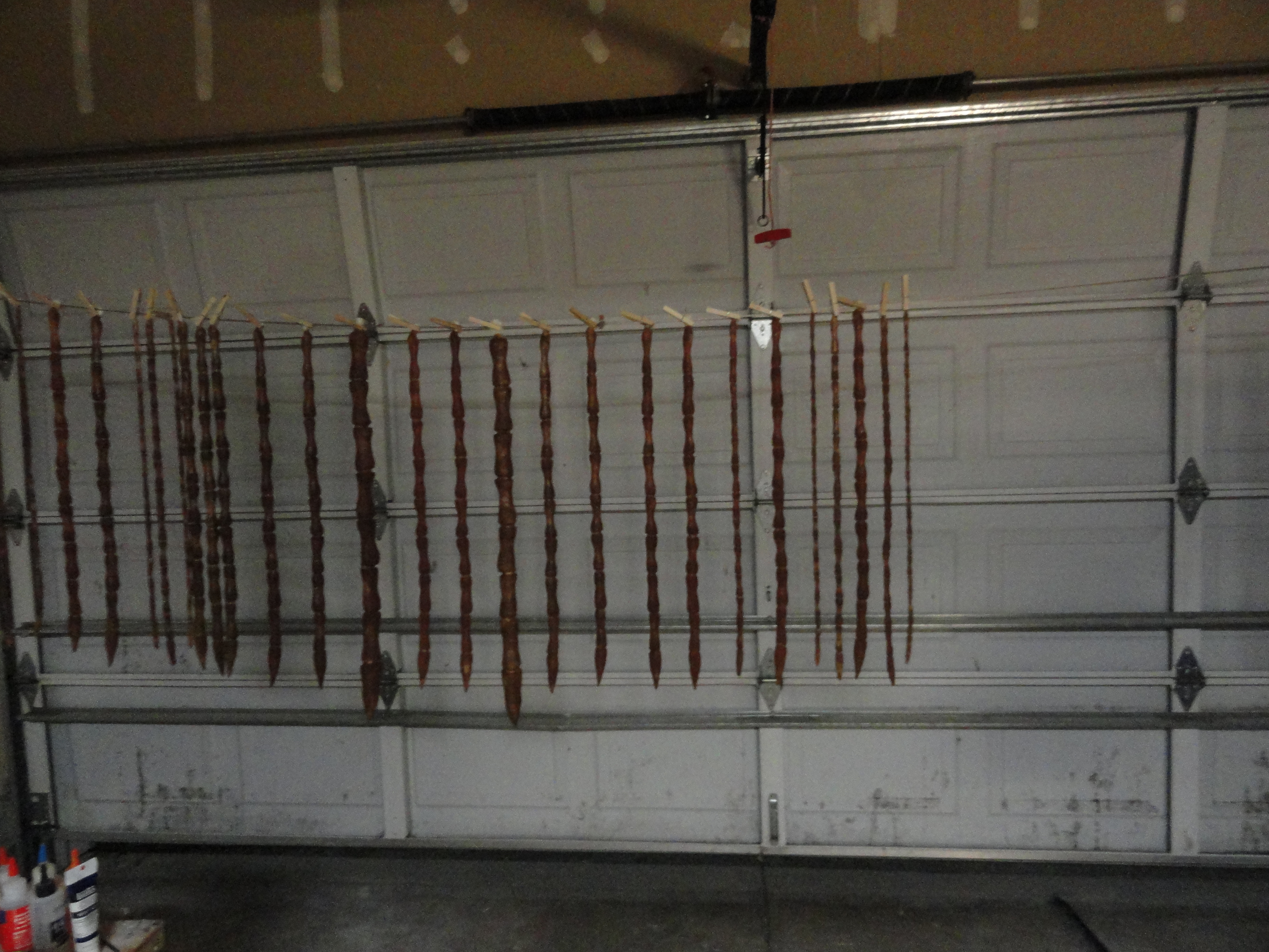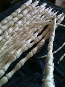 After I painted each one, I would hang it up on a clothesline to dry. After they dried, I went over and dry brushed some black into the sunken in parts of the dreads. I also kept fresh newspaper under the dreads so the paint wouldn’t stick to the dreads while I was turning and painting them.