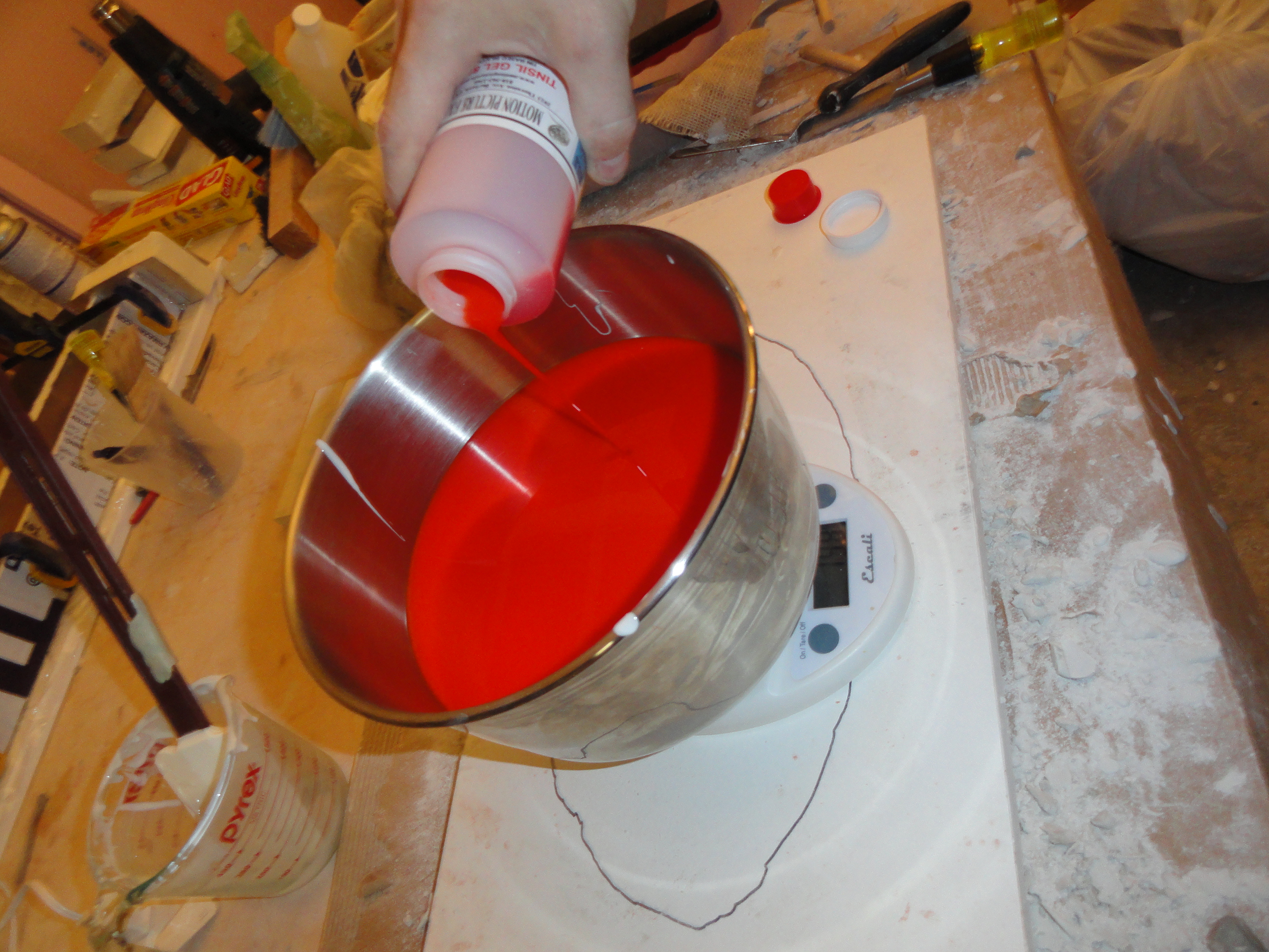 Mario did some math and figured out the volume of the dread, and how much silicone we’d need to fill each side, then we measured out the silicone, and poured it into the mold.