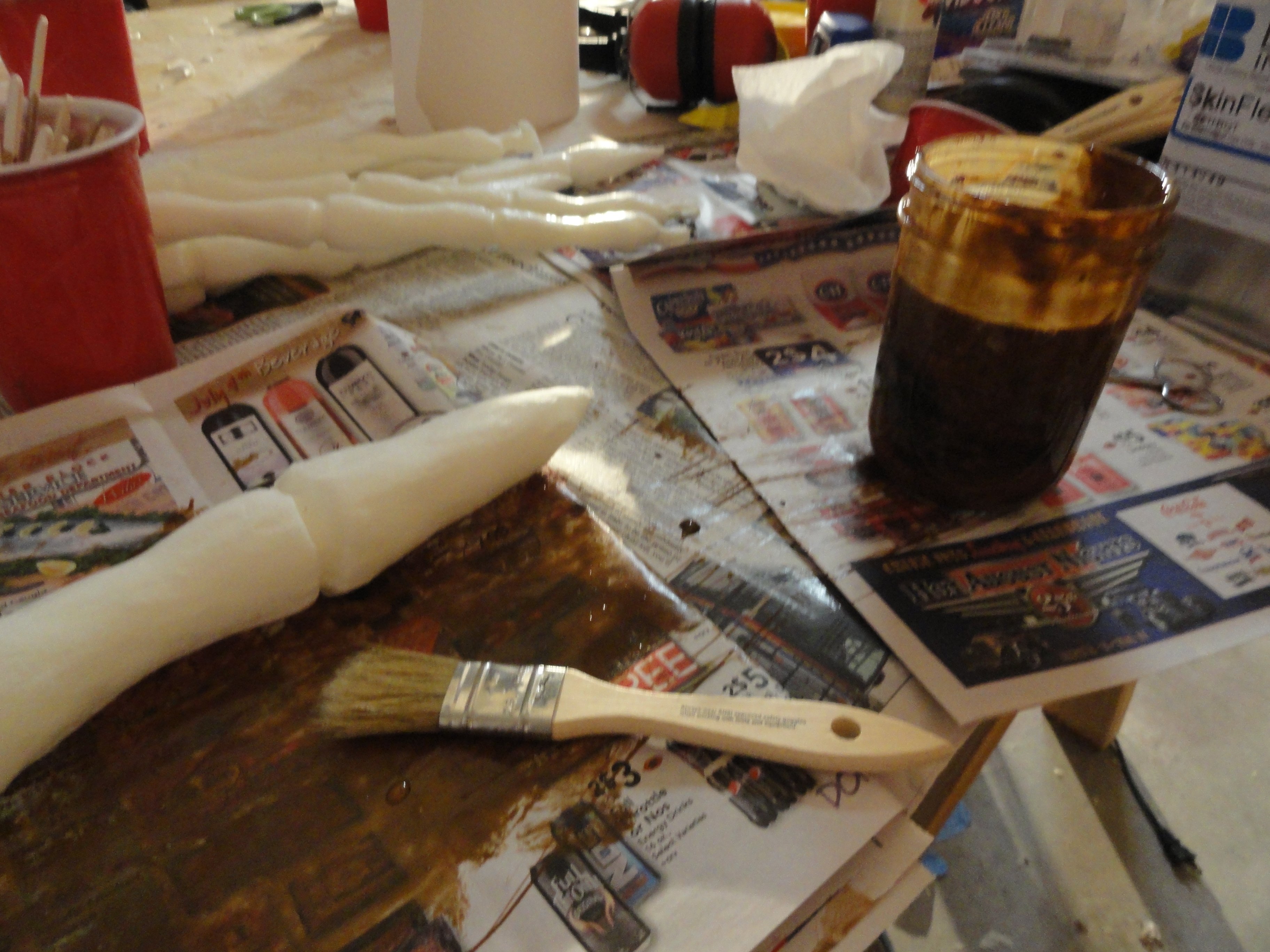 It took us a long time to find the right paint for these. Polyurethane is very hard to get paint to stick to, so we ended up using polyurethane paint, and we tinted it with some resin coloring we found at Tap Plastics. We used a glass mason jar to hold the paint we tinted, and we used a brown tint with some black mixed in there. Don’t use plastic containers, it will melt, and make sure to wear a mask while painting with this stuff!