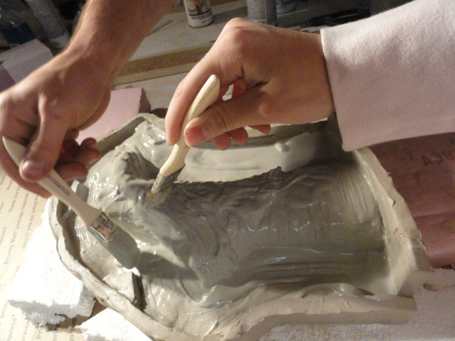 The book says to do a thin detail coat first, mixing up a small amount of ultracal into a ‘thin milkshake consistency’. In case you’re wondering about what a thin milkshake looks like, pretty much it’s just not so thin that it’s watery, but not so thick that it doesn’t pour easily. Pretty much what it looks like in the picture. Take a chip brush, and gently cover the sculpture with about a 1/4 inch thick layer of the thin ultracal. Wait about half an hour and let it set up, cutting up small pieces of burlap while you’re waiting, and then mix up a larger batch of ultracal (it takes some time to learn exactly how much for each side you’ll need, I think we ended up mixing up more a few times while we were learning). Also, WEAR GLOVES when working with this with your hands, it will dry out your hands and also it’s very bad for your skin.