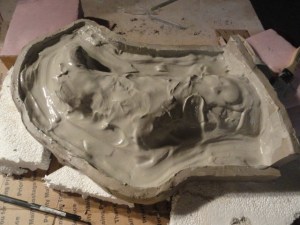 Cover the clay with a few layers of Krylon Crystal Clear- stone isn’t as sensitive to moisture as fiberglass is, but still use at least 4 layers if you’re using WED clay, and two or three if you’re using oil clay. Next, spray it with a layer of Krylon Dulling Spray- you can find this at art stores- to help keep the ultracal from sliding down and not sticking to the sculpture.