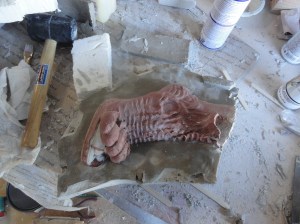 We did our two feet molds and the head and face mold in stone. The face mold was done as a one part mold, so you’d lay it down on a smooth surface that the stone wouldn’t stick to, and do your three layers just as we did before. The head mold was three pieces, which is a bit more difficult than two, but it’s all about putting your mold lines in the right places.